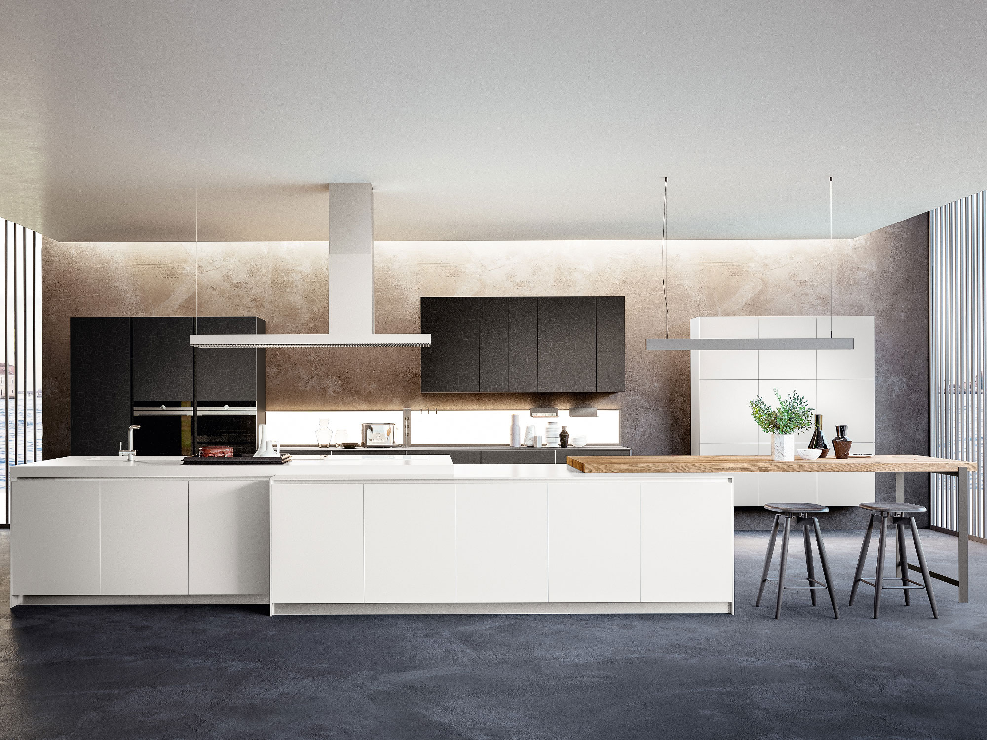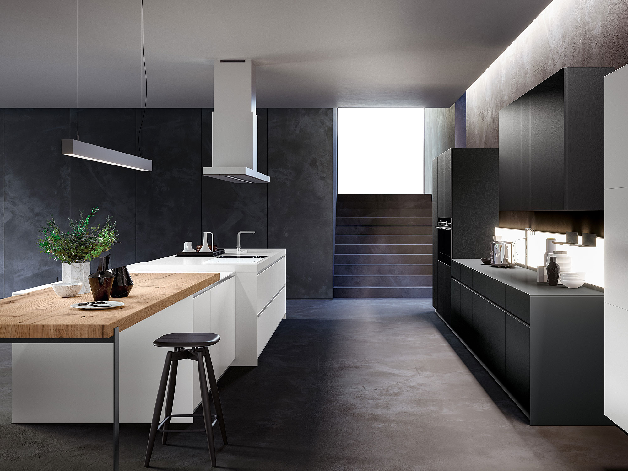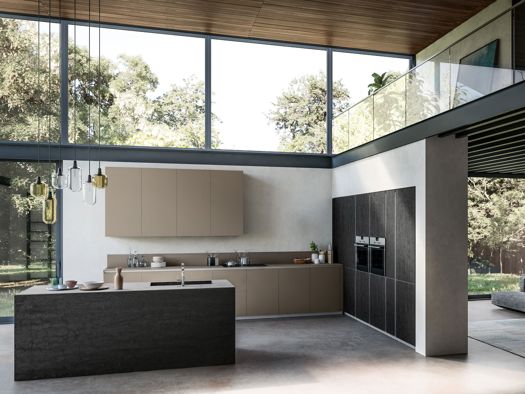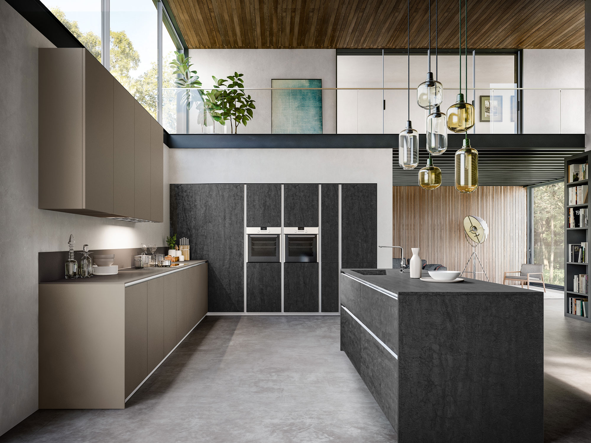 La porte de la cuisine T16, unique en son genre, allie différents matériaux et offre un choix raffiné de revêtements de façade. ( porte ép.23mm cadre aluminium, panneau en verre trempé KRION ou grès)